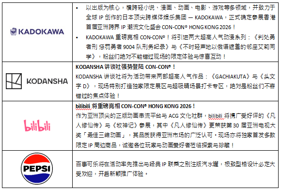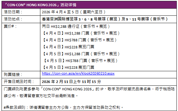 (香港,2026年2月11日)由羚邦集团全资举办,并由旗下CON-CON (HK) Limited倾力策动的首个香港本地策划、源于香港文化DNA的亚洲跨界IP潮流文化盛会「CON-CON® HONG KONG 2026」,即将于2026年4月4至5日在香港亚洲国际博览馆隆重举行。自消息公布后立即于娱乐、文化、潮玩、动漫、音乐等不同界别掀起热烈讨论。万众期待的「CON-CON® HONG KONG 2026」,今天正式重磅公布参与的IP单位、音乐节演出阵容、活动亮点以及票价详情!这绝对是香港、亚洲甚至全球粉丝年度最不可错过的IP潮流文化汇聚盛会 — 从未想像过的丰富体验,活动票价#为HK$2,288、HK$1,288、HK$788及HK$228,并于今日(2月11日)上午11时15分于Klook率先公开发售,大麦、Trip.com及01 Space等其他平台开售日期稍后公布,敬请期待!