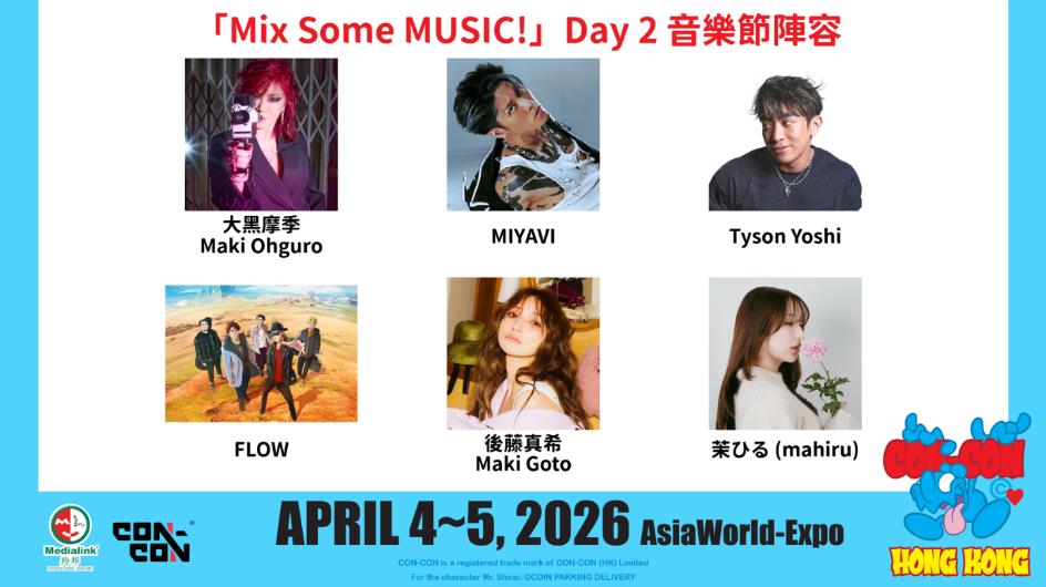 香港著名男团MIRROR成员ANSON KONG江?生亦将为CON-CON®「Mix Some MUSIC!」带来惊喜。刚推出微电影的唱作歌手Tyson Yoshi、人气乐队晚安莉莉亦会于音乐会登场献唱,与现场观众乐迷投入炽热气氛。